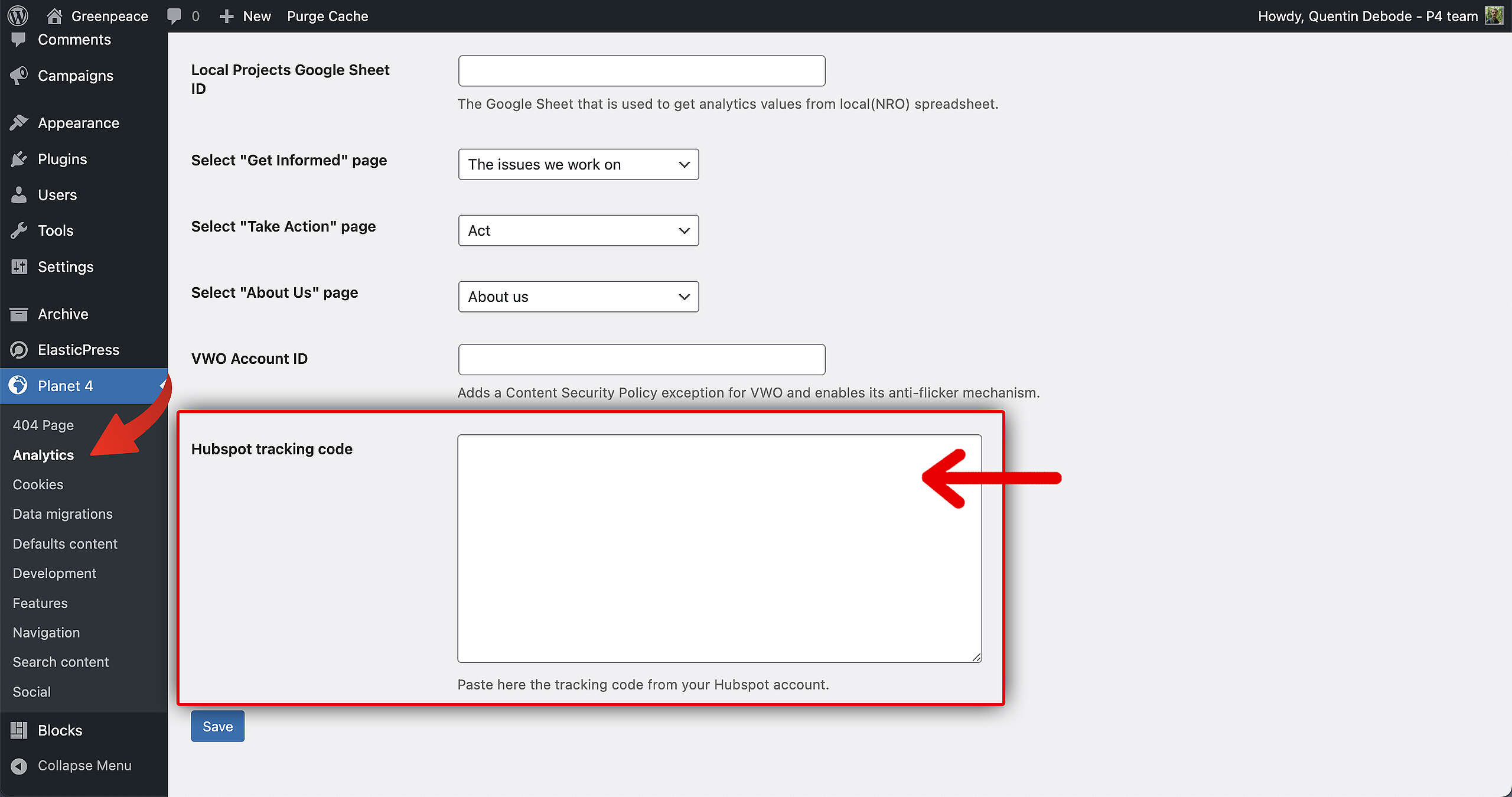 Under the Analytics settings in the Planet 4 Dashboard, there’s the option to add your Hubspot tracking code that you’ve collected in the step before. Paste the tracking code from your Hubspot account here, and click Save.