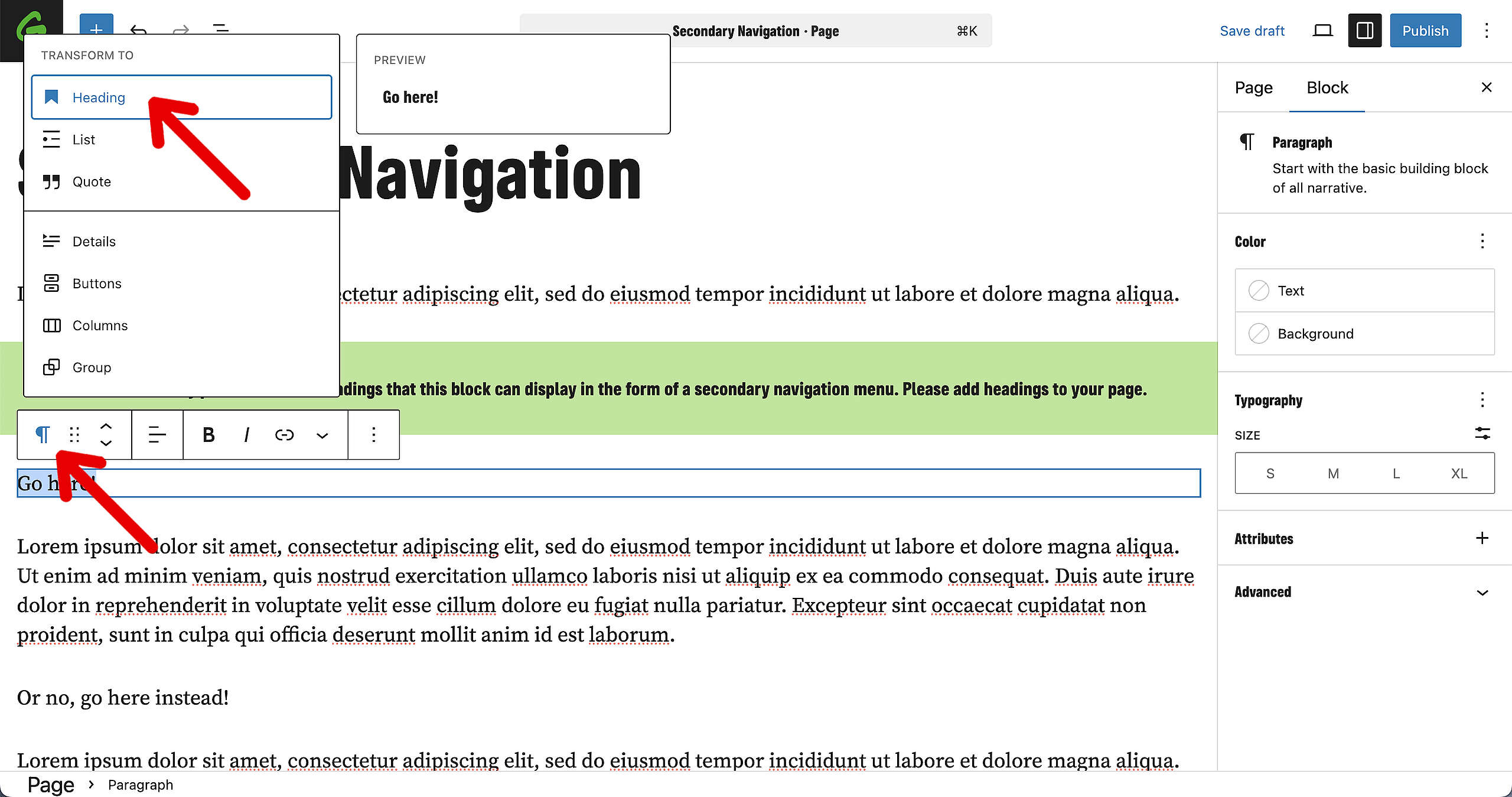 Simply select the text that will become a title on the Page, by transforming it into a Heading.