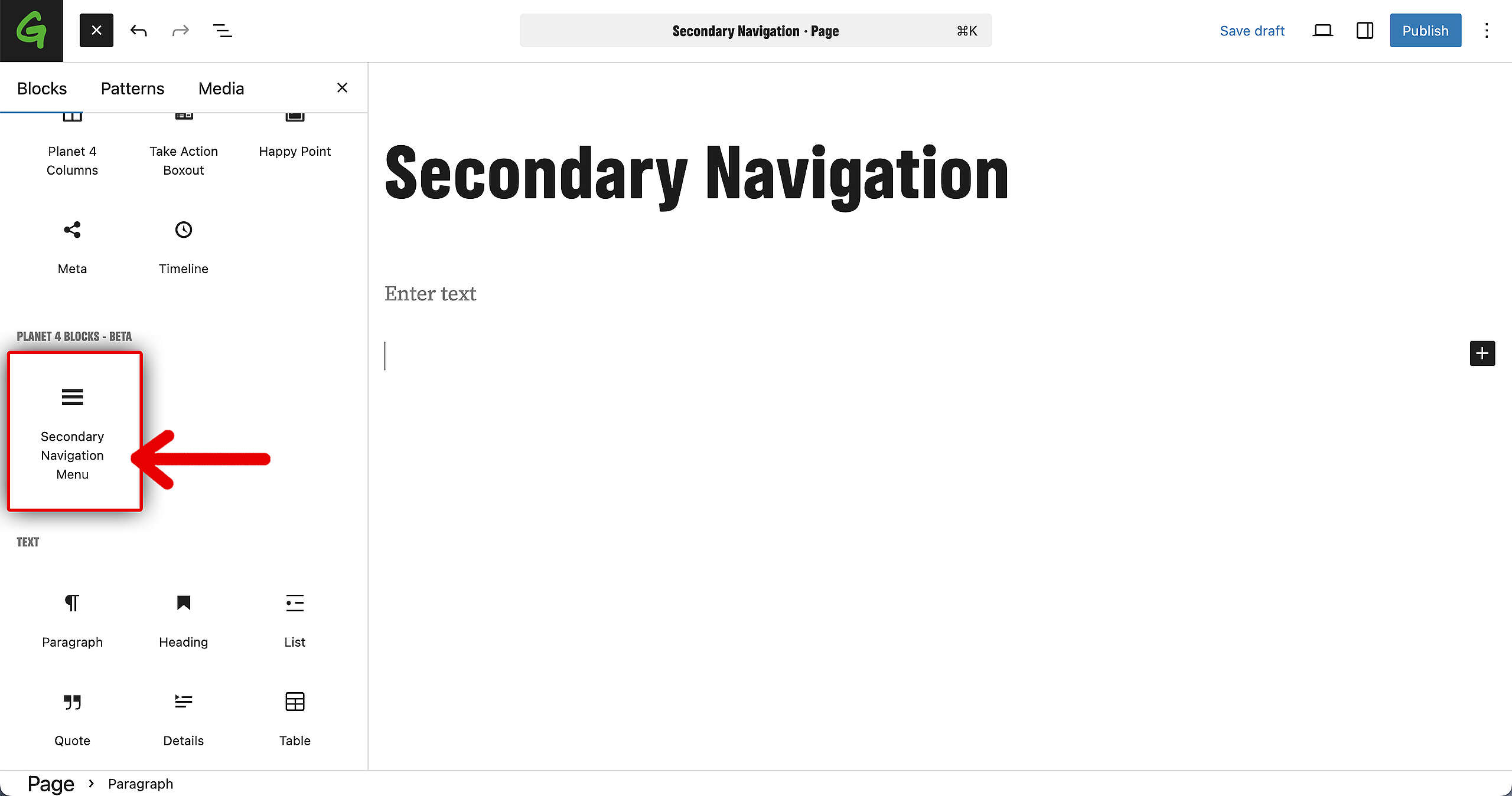 Add a new Block from the left, and go to the Planet 4 Beta Blocks. There, you’ll find the Secondary Navigation Menu. Drag and drop it into your page, or simply click on it.