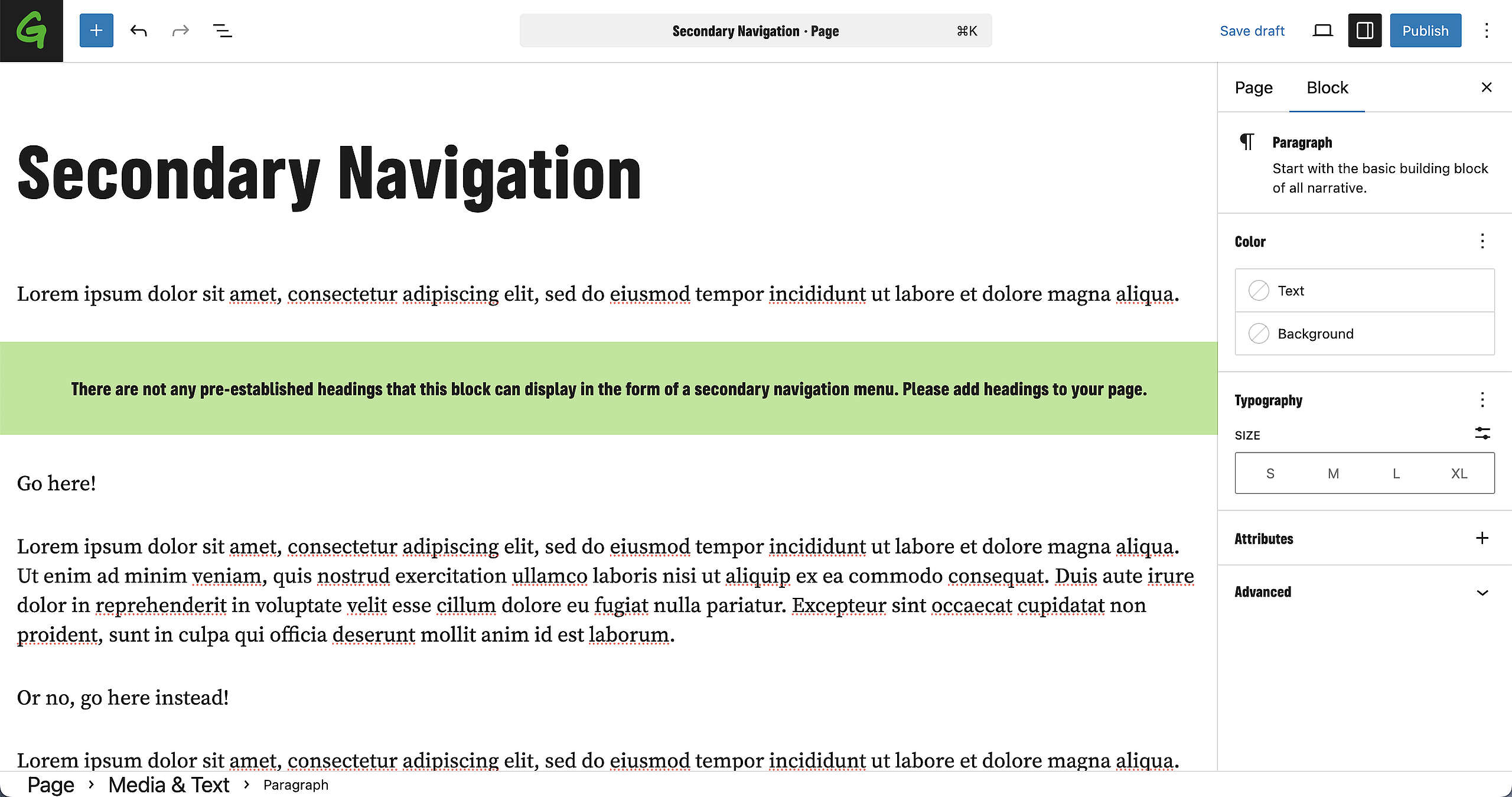 You’ll notice that the Secondary Navigation is still empty, this is because you need to add Headings.